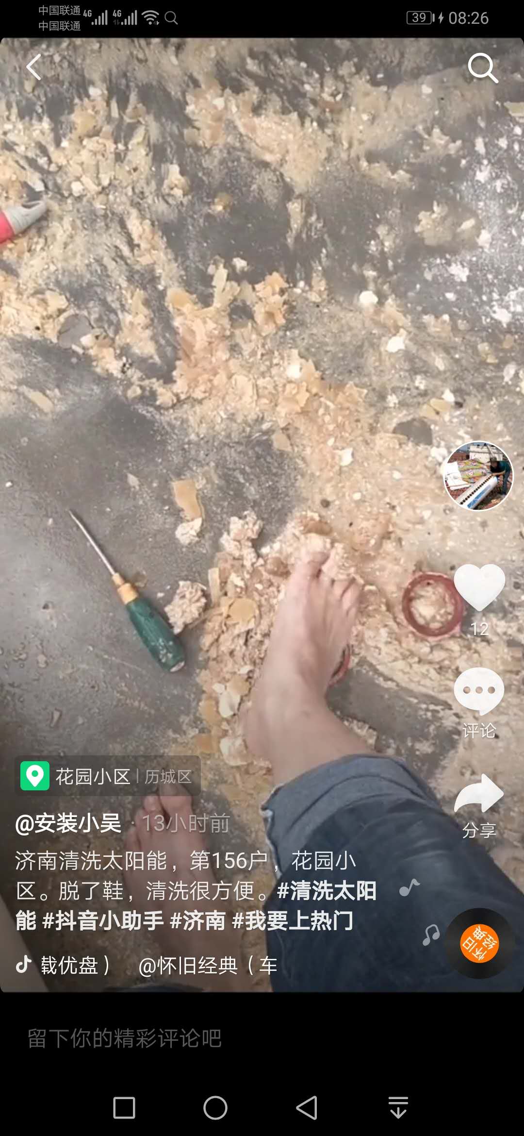 2020年7月14日 花园小区1区 十年老太阳能除垢开始了 因为天热 放水也多 工人师傅干脆光脚丫子了 除的很干净 客户很满意